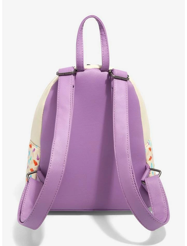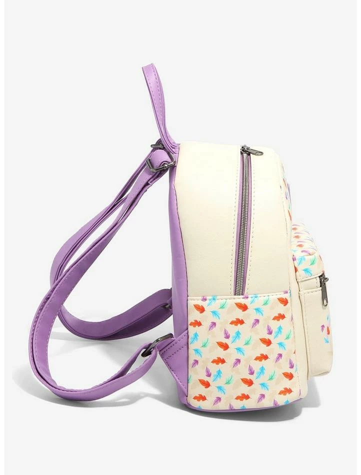 Make sure you bring your essentials with you before heading around the riverbend! This mini backpack fromย Pocahontasย is painted with all the colors of the wind, with vibrant leaves floating all around the front and sides. A chibi Pocahontas, Meeko and Flit are illustrated on the front zipper pocket. Comes with an interior drop pocket, adjustable straps and gunmetal-tone hardware.