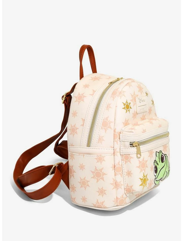 Get ready for the best day ever with your BFF Pascal! He’s ready to encourage you to follow your dreams. This mini backpack from Tangled features Pascal on the front zipper pocket in an illustrated-inspired design. There is an allover print of the Corona kingdom sun emblem – some are even a shiny gold! Adjustable straps and side pockets.