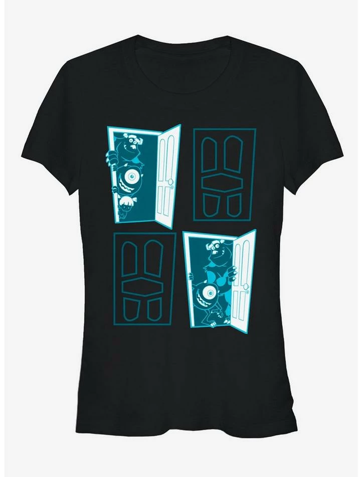 What’s that rattling around behind your closet door? It’s the Monsters Inc. Closet Door Portal Black T-Shirt! Sulley, Mike, and Boo peek out from behind a closet door on this awesome fitted black Monsters Inc. shirt. 100% Cotton.
