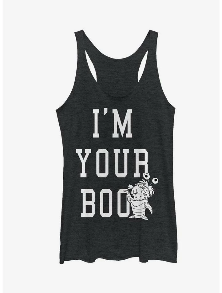 Mary, or Boo, is so cute even monsters can’t help but love her! Join in the fun with the Monsters Inc. I’m Your Boo Heather Black Racerback Tank Top! The lovable Boo is portrayed in her monster suit beside the phrase “I’m Your Boo” in white text down the front of this black Monsters Inc. tank top. 50% Polyester, 25% Cotton, 25% Rayon. Designed with raw-edge hems.