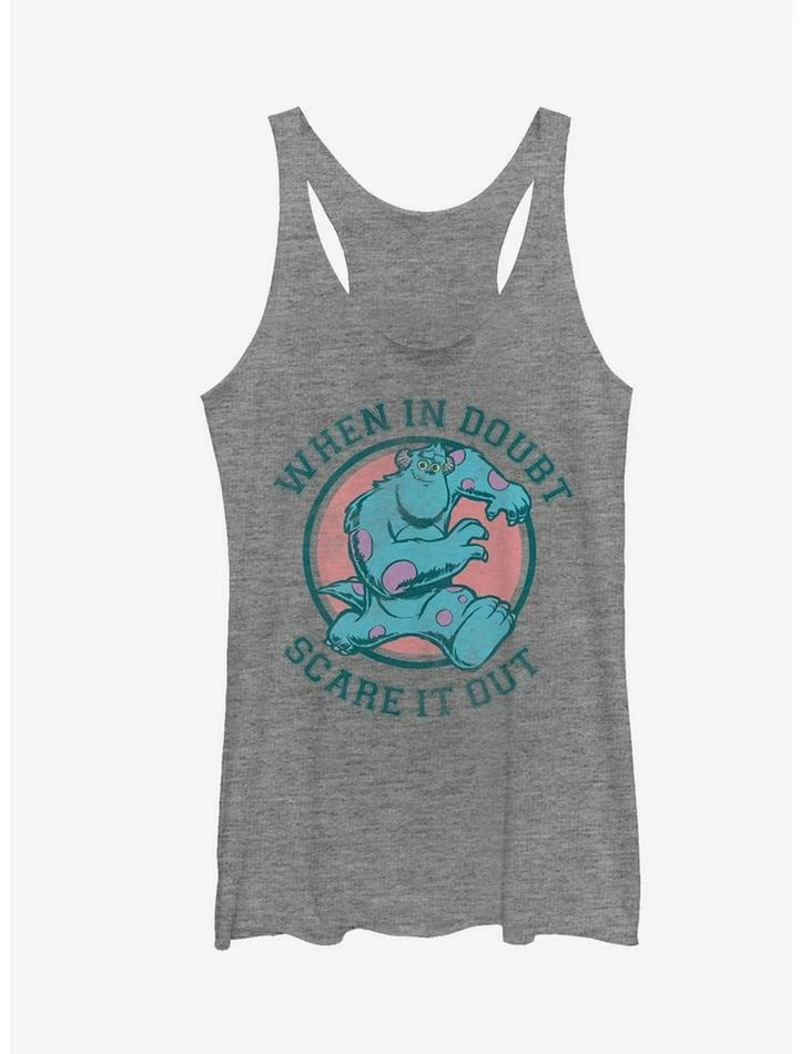 There’s nothing that a good scream can’t fix, at least that’s what Sulley and the Pixar Monsters Inc Sulley in Doubt Scare it Out Heather Gray Racerback Tank Top would tell you! Sulley races towards you in a distressed print and is encircled by “When In Doubt Scare It Out” on this cute gray Monsters Inc tank top. 50% Polyester, 25% Cotton, 25% Rayon.