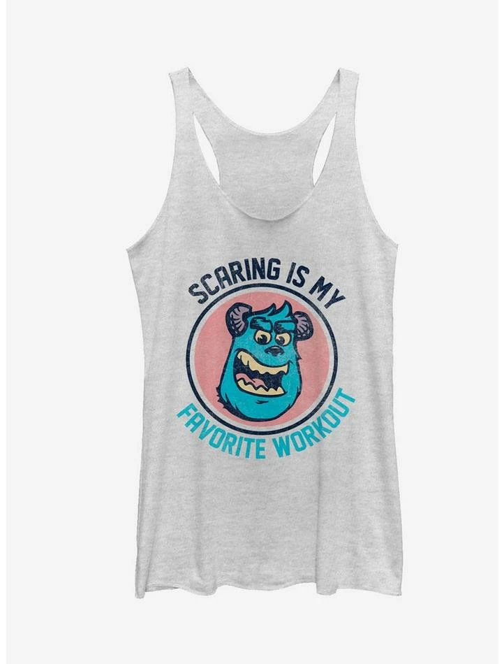 Screaming burns calories, right? So scream away with the Monsters Inc. Sulley Scaring is My Favorite Workout Heather White Racerback Tank Top! A slightly distressed print of Sulley portrays the lovable blue monster mid roar with “Scaring Is My Favorite Workout” encircling him on this awesome light gray Sulley tank top. 50% Polyester, 25% Cotton, 25% Rayon. Designed with raw-edge hems.