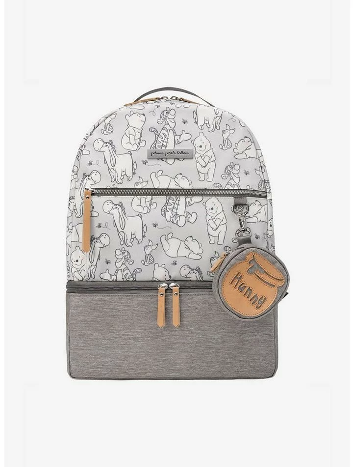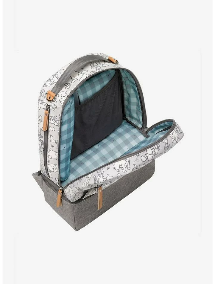 The District Backpack is outfitted in the happy smiles of everyone’s favorite childhood characters,ย with a picnic-inspired plaid lining and delightful Hunny pot coin purse. Features zip-around, insulated bottom section to carry snacks or bottles, a removable, water-resistant, and washable changing pad, and a monogrammed wipes case.