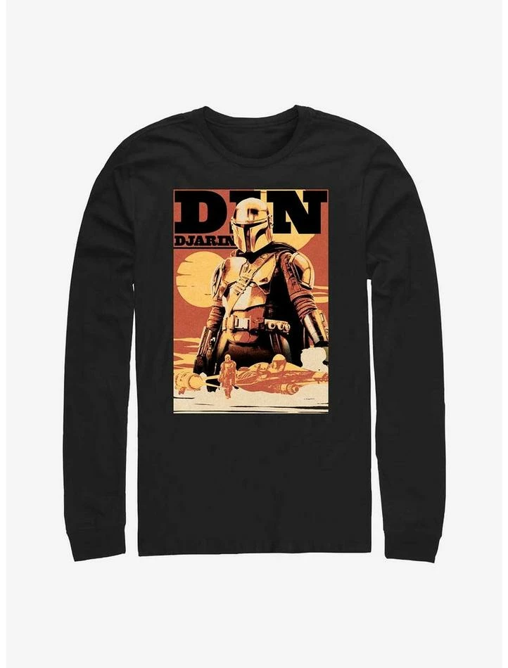 This is the way. Din Djarin appears before the two suns of Tatooine on this long-sleeved black graphic tee inspired by the Disney+ series Star Wars: The Book of Boba Fett.