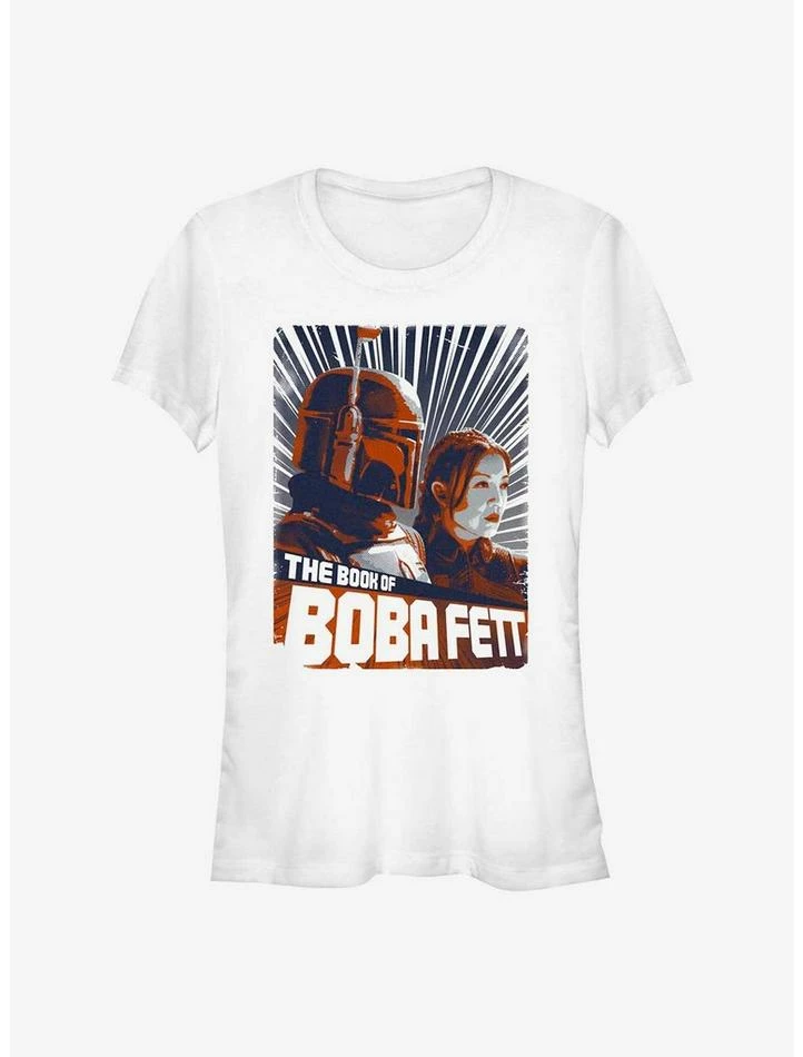Fett + Shand. Name a better duo, we’ll wait. This fitted white graphic tee — inspired by the Disney+ series Star Wars: The Book of Boba Fett — features Boba Fett and Fennec Shand in profile.