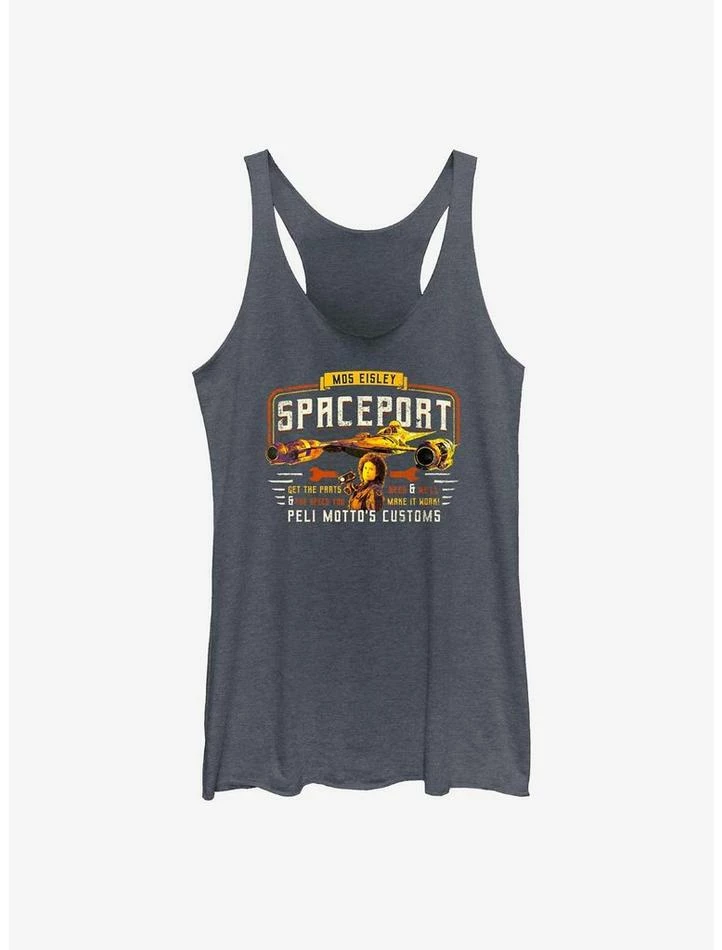 Visit the Mos Eisley Spaceport for all the parts and specs you need! This heather navy blue racerback tank features Peli Motto, the scrappy engineer from Chapter 5 of the Disney+ series Star Wars: The Book of Boba Fett.