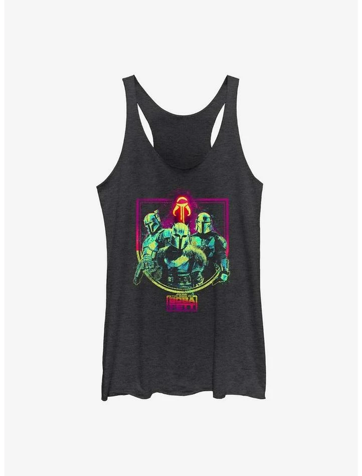 Hold onto your Darksaber! Our heather black racerback tank — inspired by Episode 5 of the Disney+ series Star Wars: The Book of Boba Fett — features remaining Mandalorian Guild members Paz Vizsla, The Armorer and Din Djarin, with a Mythosaur skull above and show logo below.