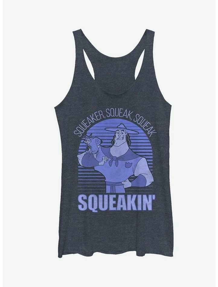 Dress like a Junior Chipmunk and help Kronk speak to woodland creatures with the Disney Emperor’s New Groove Kronk Squirrel Squeak Juniors’ Racerback Tank Top! Kronk is printed with his squirrel friend and the quote “Squeaker, Squeak, Squeak Squeakin'” across the front of this relaxed fit tank top. Designed with raw-edge hems.