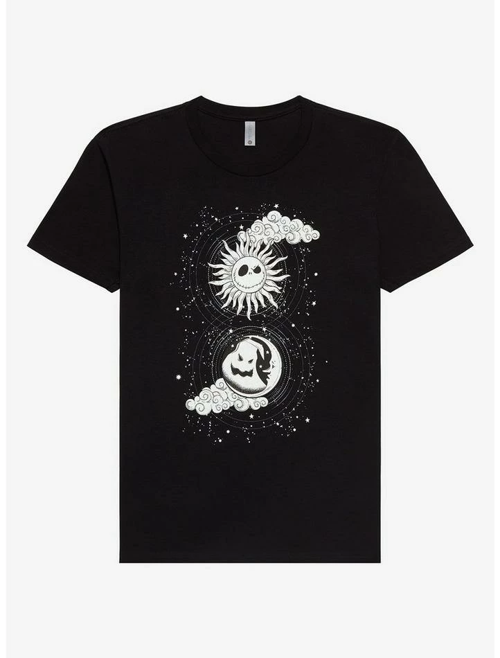 Bring some celestial vibes to Halloween Town with this mystical tee! Featuring Jack Skellington and Oogie Boogie highlighted in the center of a sun and moon.