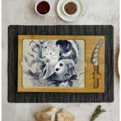 What’s this? What’s this? Well, Jack, it’s a The Nightmare Before Christmas wooden cutting board that comes with a tempered glass serving tray featuring Jack, Oogie Boogie, Zero and some bats. Solid rubberwood base with bamboo accent, over 96 square inches of cutting surface, and a full-tang, stainless steel, fork-tipped cheese knife with bamboo handle stored in the base.Β