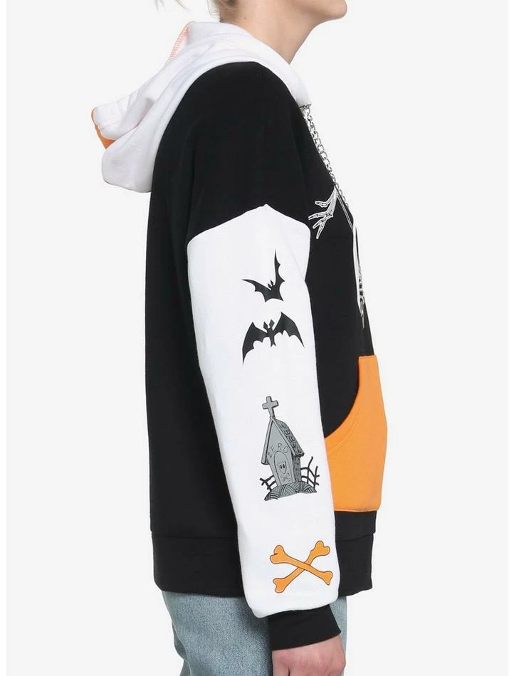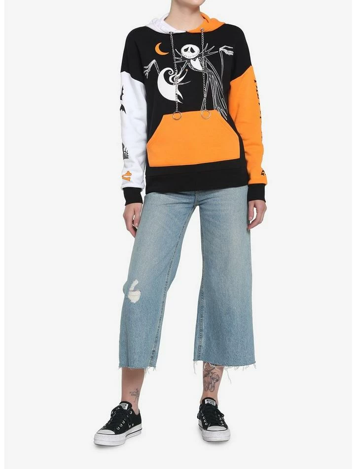 Everybody scream, everybody scream! We’ve got a new The Nightmare Before Christmas hoodie for you! This one has white, orange and black color-blocking and features Jack with Zero on the front. Bats, bones, Zero’s house and “The pumpkin king” are featured along the sleeves. Complete with a kangaroo pocket and silver-tone chain chords.
