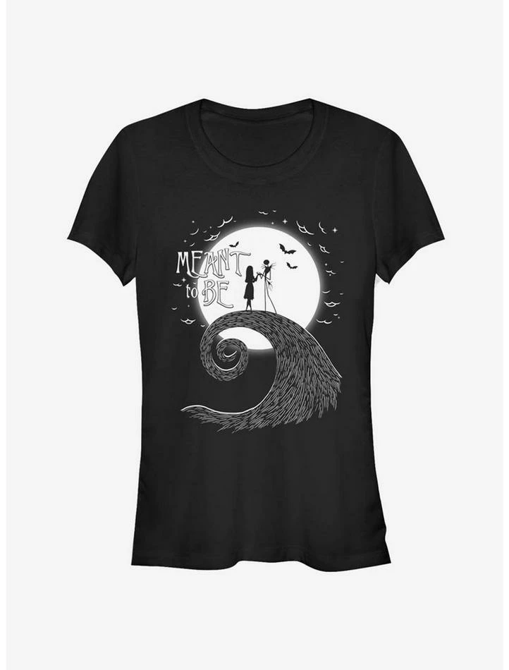 Jack and Sally forever! This fitted, lightweight black graphic tee — inspired by The Nightmare Before Christmas — features the two lovebirds atop a moonlit Spiral Hill, with “Meant to Be” verbiage next to them.