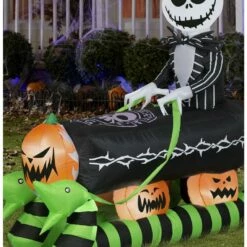 Fans of The Nightmare Before Christmas will love this Halloween Airblown Inflatable Jack Skellington in a coffin sleigh! Accented with scary jack-o’-lanterns and snake rails, this Nightmare Before Christmas inflatable makes a spooktacular addition to your outdoor Halloween decorations. Setup is super simple. Just plug it in, stake it down and watch the magic unfold. Display this Disney Halloween decoration as a standalone or combine it with other Disney Airblown Inflatables to create a custom scene.