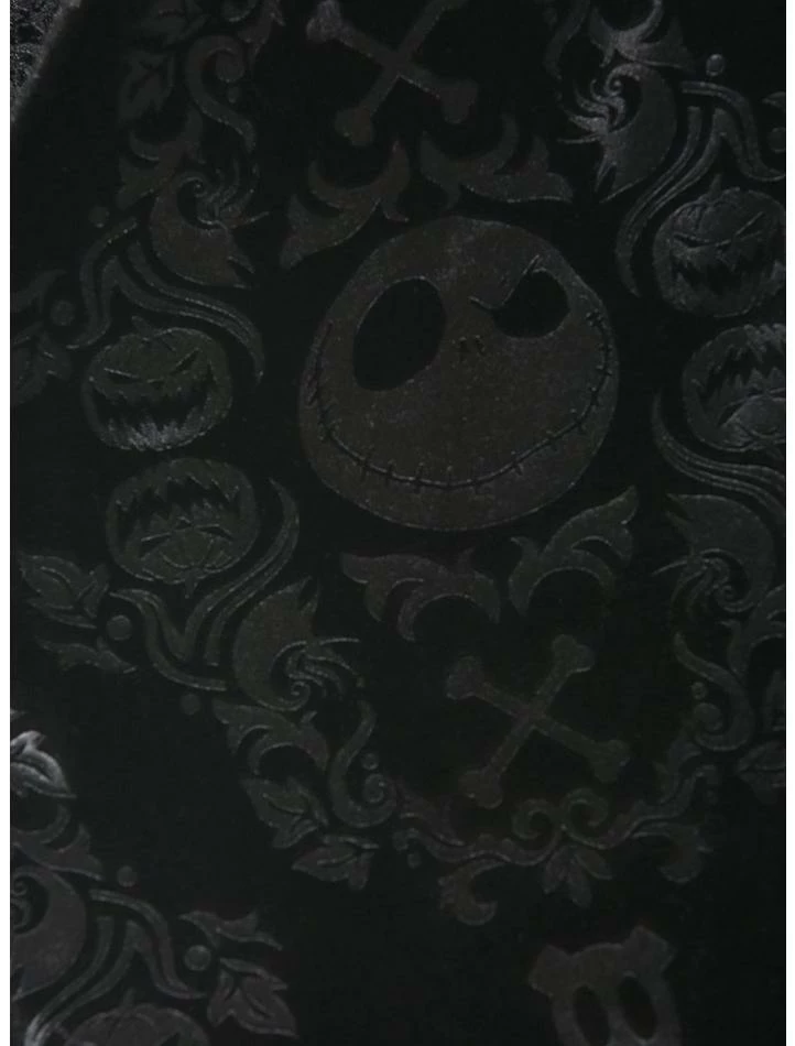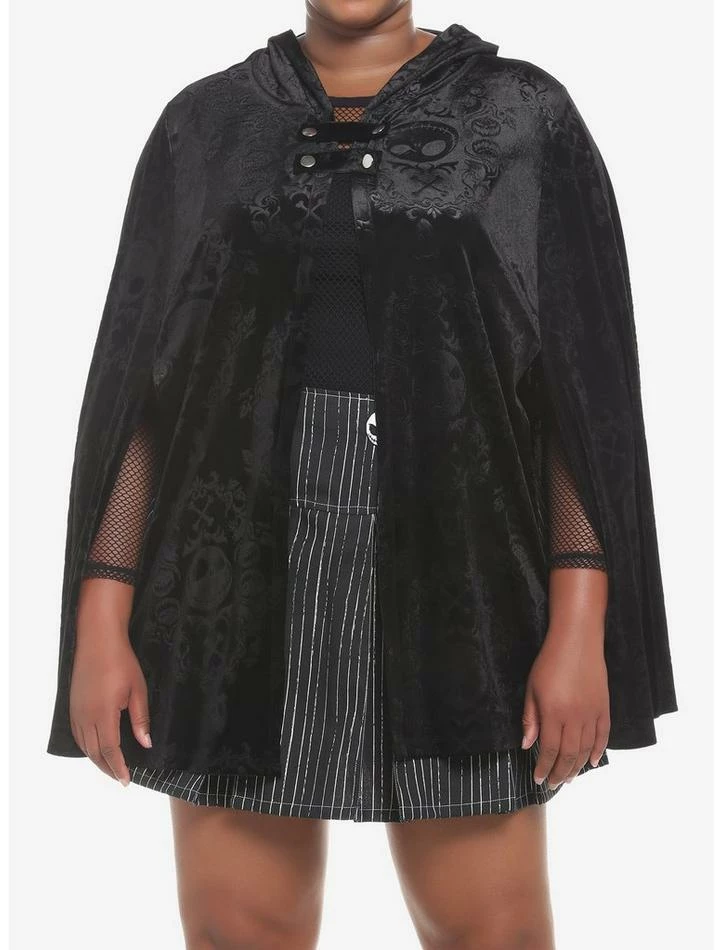 Look frightfully stylish while making Christmas in this The Nightmare Before Christmas cape! The black velvet features a design that highlights Jack’s face, bones and filigree. Comes with a hood, arm slits and a double snap-button closure.
