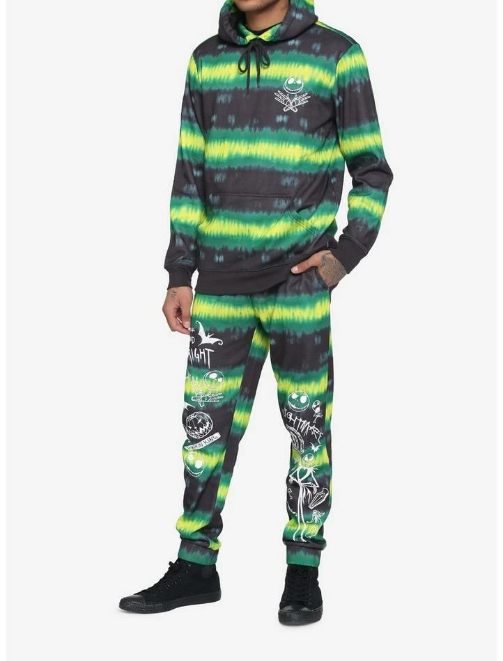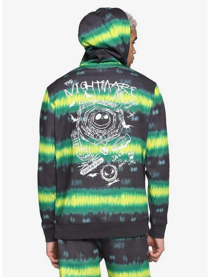 Spiral down to Halloween Town in this black hoodie featuring neon green tie-dye stripes with a spiral graphic of Jack Skellington heads and bats.