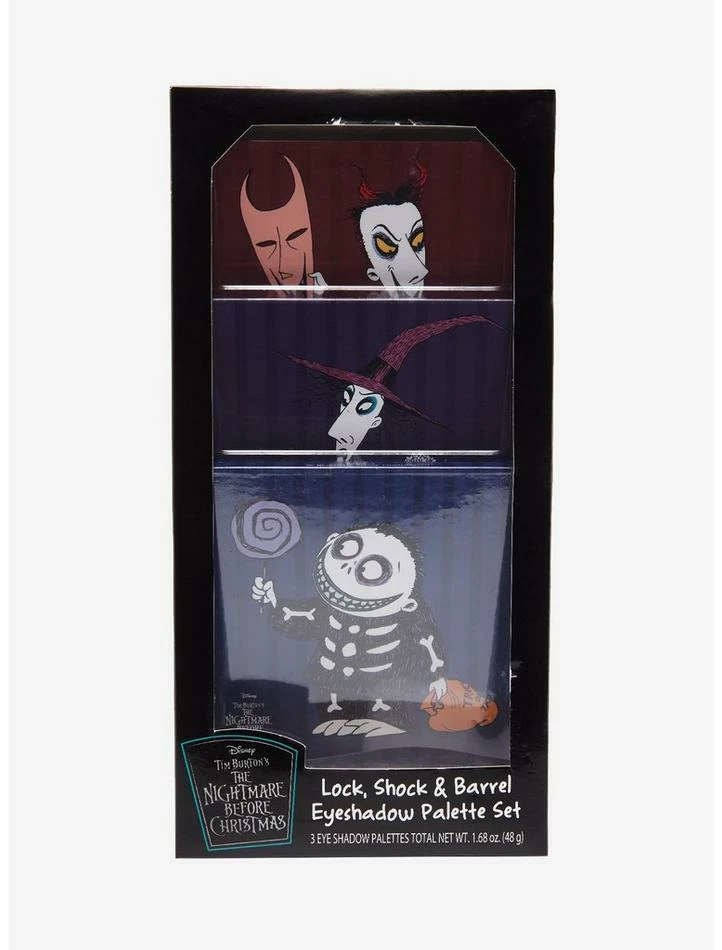 Gift your own trio of terror with these eyeshadow palettes! These three of a kind The Nightmare Before Christmas palettes feature Lock, Shock and Barrel on the front of each. Lock’s palette has fiery red shimmers and mattes, while Shock’s palette showcases deep purple hues and Barrel’s palette comes with cool tone shades. Includes 3 eyeshadow palettes.