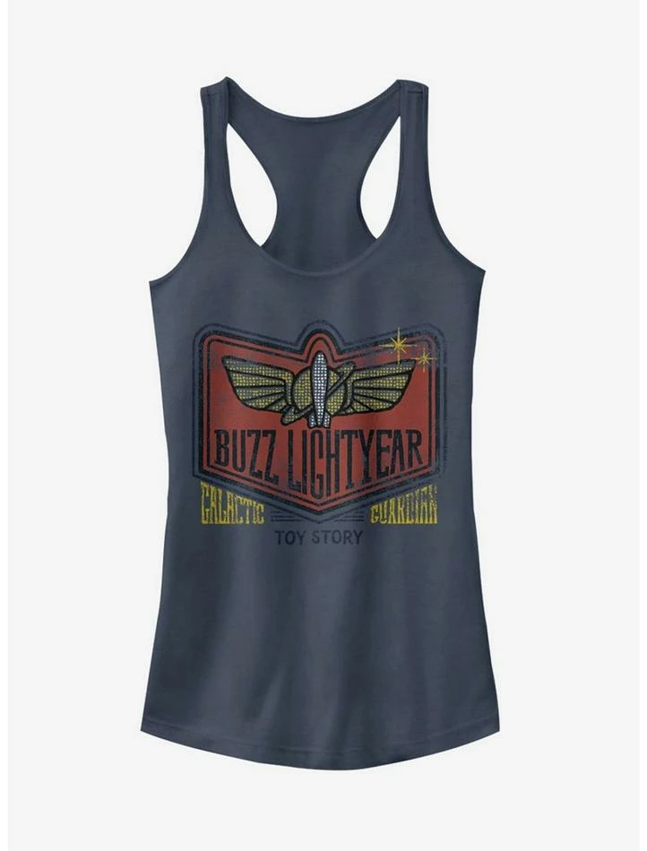 It’s your chance to dress as your favorite Space Ranger with the Toy Story Buzz Lightyear Galactic Guardian Indigo Blue Racerback Tank Top! Buzz Lightyear’s Galactic badge is printed in a distressed style on this awesome Buzz Lightyear shirt! 60% Cotton, 40% Polyester.