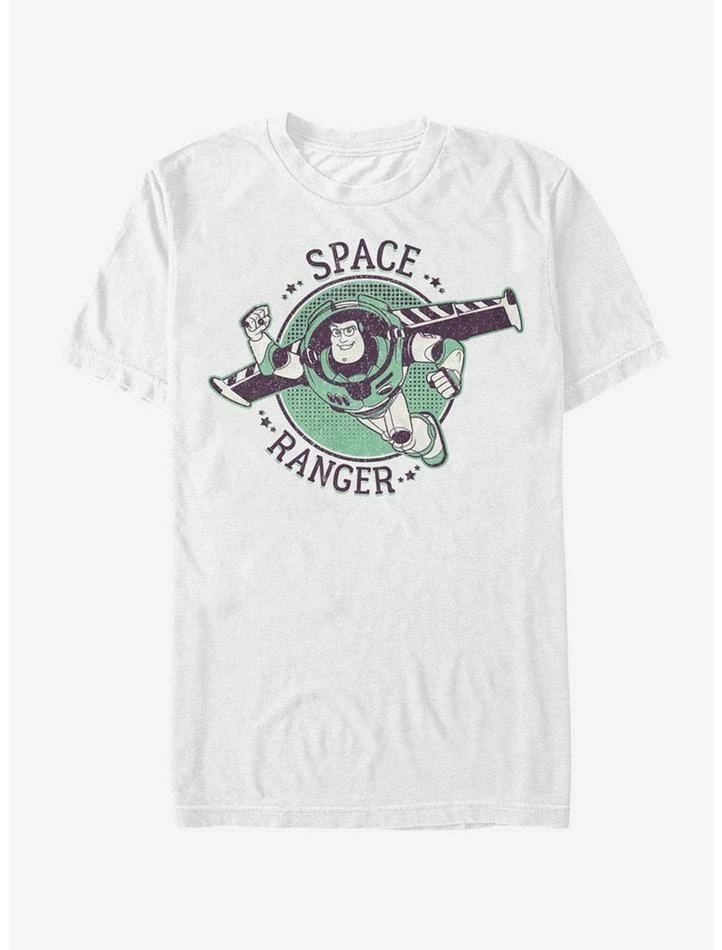 Strap on your wings and join Buzz Lightyear for a space adventure on the Toy Story Buzz Lightyear Space Ranger White T-Shirt! A distressed graphic shows off the lovable Buzz Lightyear flying across this awesome white Buzz Lightyear shirt next to his title “Space Ranger” on the front. 100% Cotton.