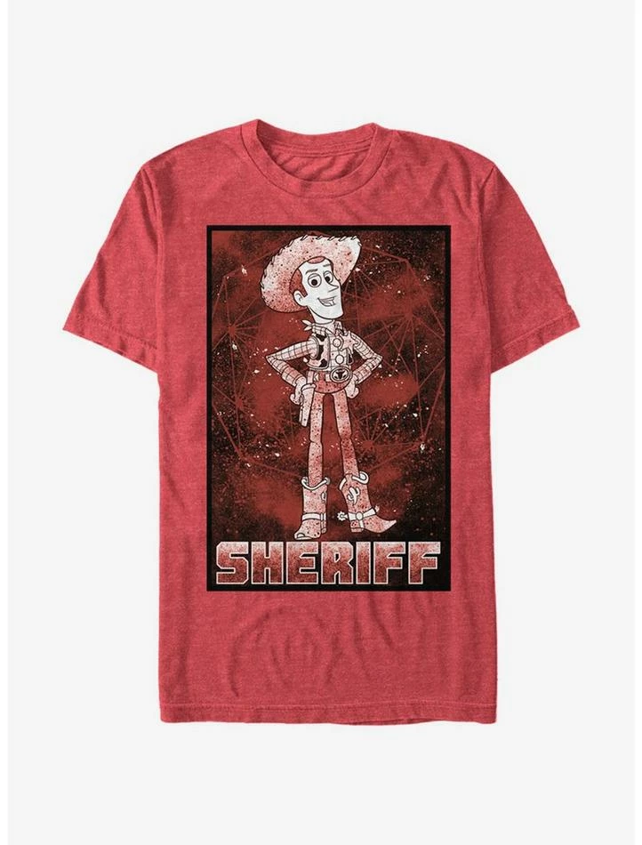 Reach for the sky with the Sheriff Woody Poster Heather Red T-Shirt. A distressed poster-style print of Woody reads “Sheriff” printed on the front of this cool red Woody shirt. 60% Cotton, 40% Polyester.