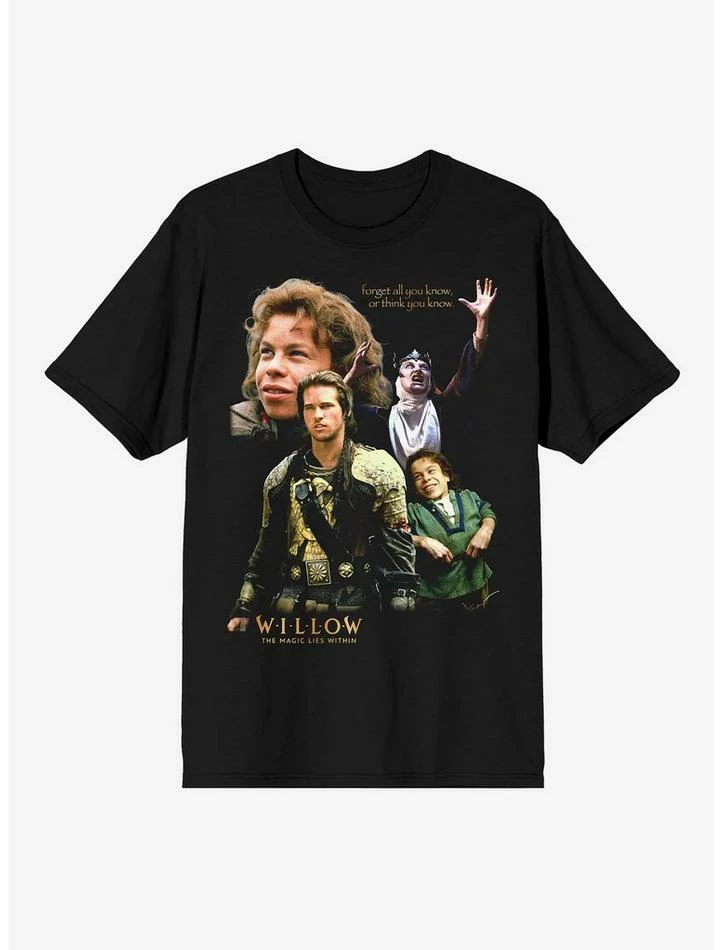 Beyond good… Beyond evil… Beyond your wildest imagination… comes this black tee featuring a Willow collage with characters and “Forget all you know, or think you know.”